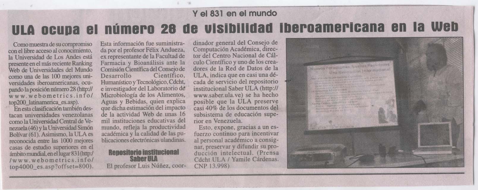 http://repositoriodigital.fundacite-merida.gob.ve/handle/123456789/5883| Título : | Ula ocupa el número 28 de visibilidad iberoamericana en la web |
