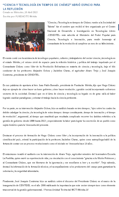 http://repositoriodigital.fundacite-merida.gob.ve/handle/123456789/7437| Título : | "ciencia y tecnología en tiempos de Chávez" abrió espacio para la reflexión |