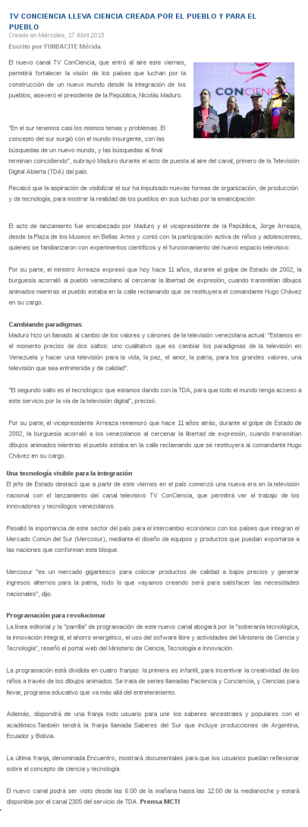 Título : Tv conciencia lleva ciencia creada por el pueblo y para el pueblo
