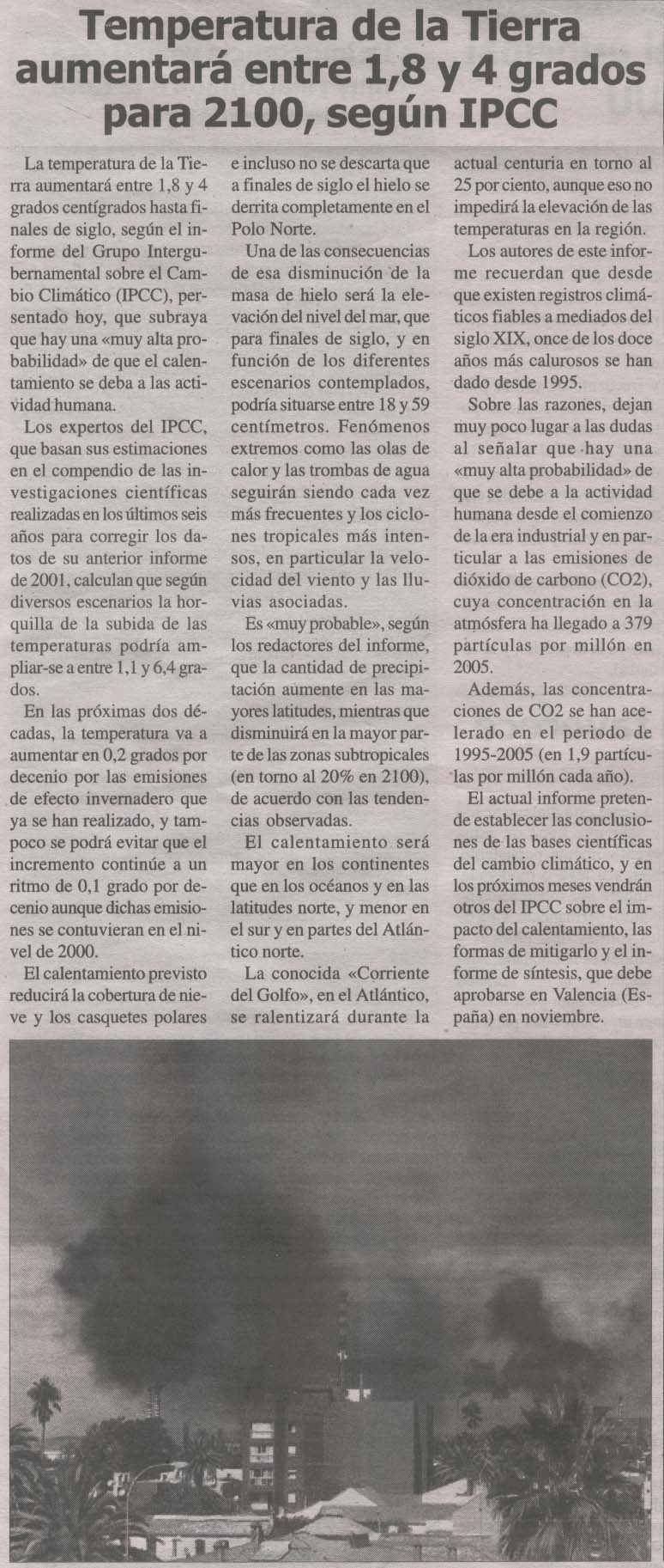 http://repositoriodigital.fundacite-merida.gob.ve/handle/123456789/7763| Título : | Temperatura de la tierra aumentará entre 1,8 y 4 grados para 2100, según ipcc |