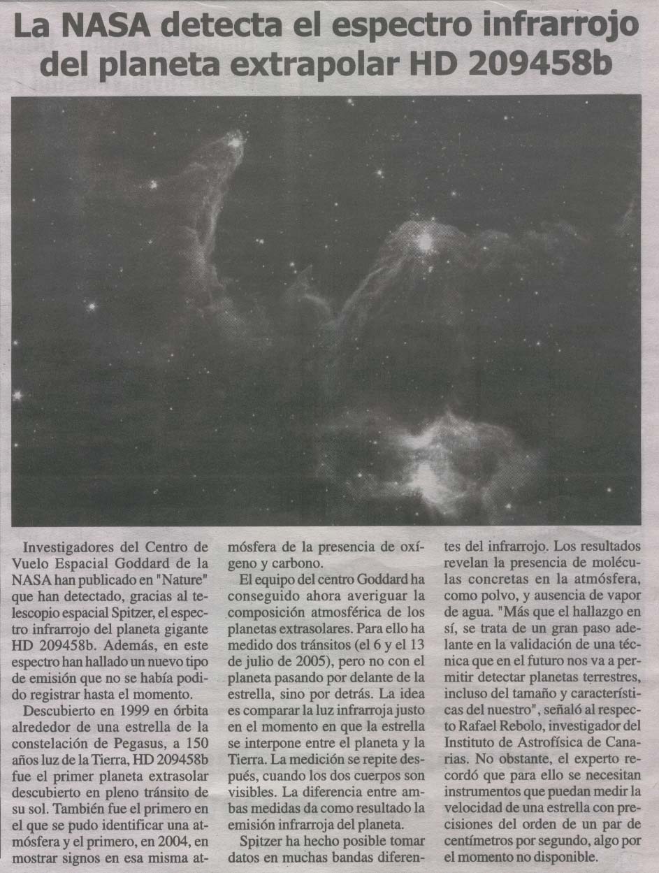 Título : La nasa detecta el espectro infrarrojo del planeta extraplolar hd 209458b